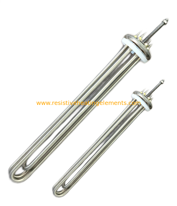 The heating element is bent into a hairpin shape and welded or brazed to a threaded connection, allowing it to be screwed directly into the threaded hole of the container.